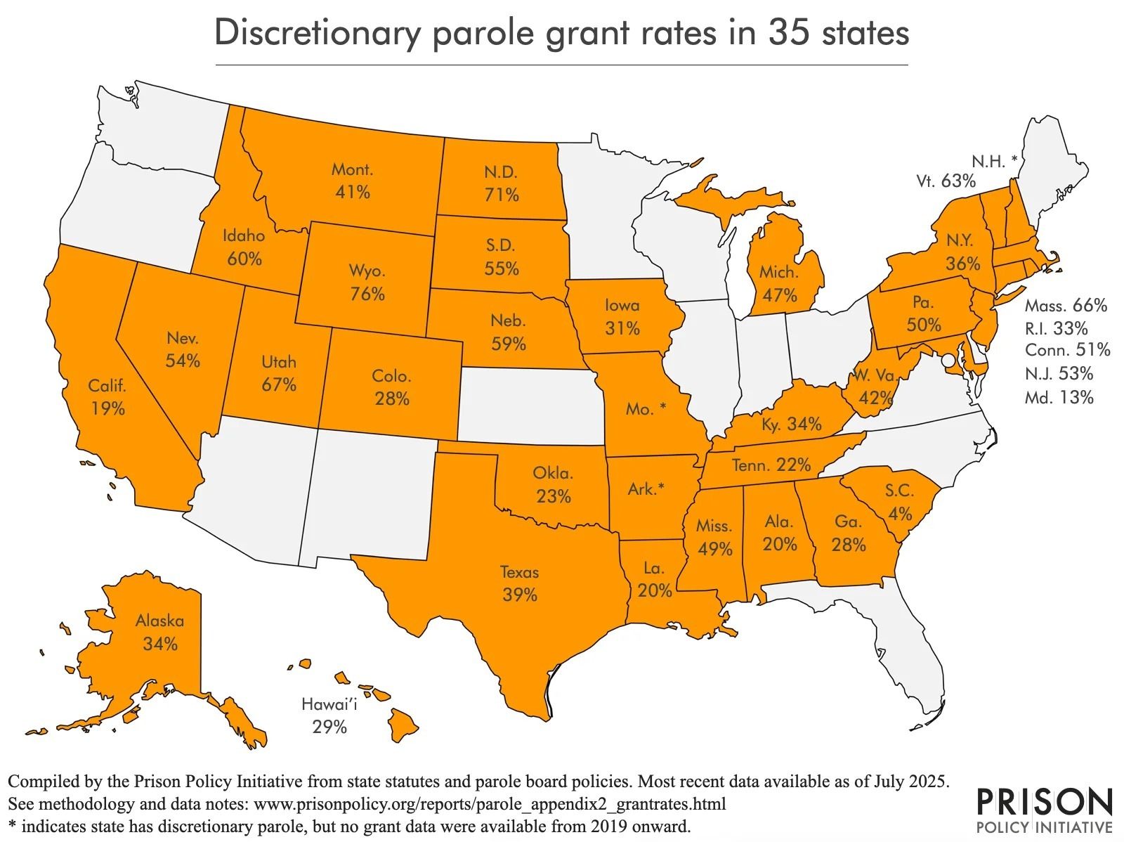 California is one of 35 states that allow people to appear before a parole board, which decides whether they should be released before their sentence ends based on factors such as conduct, rehabilitation, and perceived risk. California granted parole in only about one in five cases in 2024, according to the nonprofit Prison Policy Initiative, or PPI.