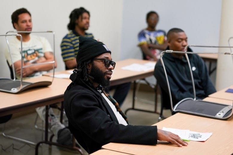 Brian Carter, the parenting facilitator, teaches the final class in the Fathers and Families Center’s Up and Out program Nov. 14, 2025, at the Duvall Residential Facility in Indianapolis. Credit: Stephanie Amador for Mirror Indy